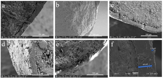 Scanning electron microscopy (SEM) images of sections (a–f) of coated urea. (a) The PACU with 8% content of PA. (b) The WPACU with 8% content of PA and 1% content of RBW. (c) The WPACU with 8% content of PA and 1% content of CAW. (d) The WPACU with 8% content of PA and 1% content of BW. (e) The WPACU with 8% content of PA and 1% content of PW. (f) The WPACU with 8% content of PA and 1% content of CW (The thickness of the WPA film was 60 μm, in contrast to the CW film’s 7.5μm).