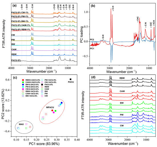 FTIR-ATR spectral characteristic of the wax and WPACU. (a) Comparison between the FTIR-ATR spectra of wax and WPACU. (b) Principal component loading of FTIR-ATR spectra for wax and WPACU. (c) Principal component scores of FTIR-ATR spectra for different PACU and WPACU. (d) Comparison among the FTIR-ATR spectra of the WPACU (8% PA and 1% wax) membrane at the end of the release phase.