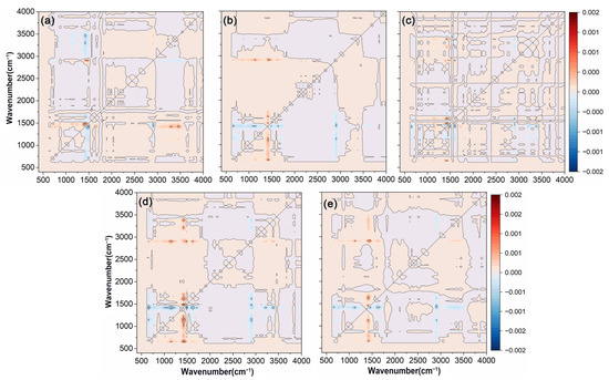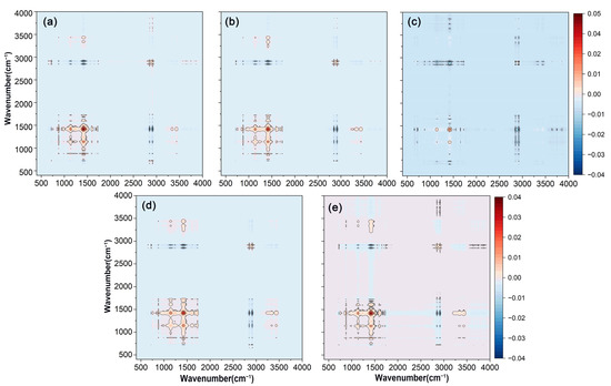 Asynchronous correlation spectroscopy significantly enhanced the resolution of the original spectrum, enabling the detection of subtle spectral bands that were not easily identified in one-dimensional analysis. As depicted in Figure 4, cross-peaks between C=O at 1730 cm−1 and C-H at 1463 cm−1, as well as cross-peaks between C=O and O-H at 1463 cm−1 and 3200 cm−1, and 1463 cm−1 and 3444 cm−1, were discernible through asynchronous spectroscopy, which suggested that the functional groups corresponding to these wavelengths might be influenced by external factors, and their signal intensity changes occurred in a distinct sequence. Additionally, the presence of different spectral information at the two wavelengths corresponding to these cross-peaks suggested potential hydrogen bonding between the functional groups represented by these wavelengths [55]. Asynchronous correlation spectra not only improved spectral resolution, but also helped to determine the specific sequence of changes in different chemical groups under external disturbances [56]. The order of wavelength changes was 2915 → 1730 → 1463 → 1174, 3200, 3444 cm−1, with changes in the hydrophobic functional group C-H occurring earlier than those of other functional groups.