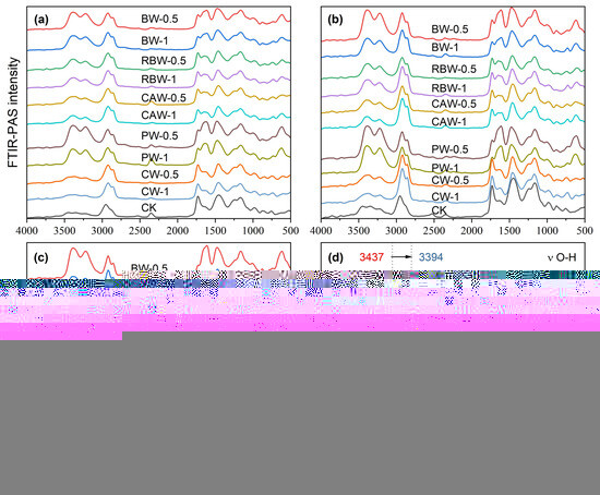 Photoacoustic spectra of different types of bio-wax coated fertilizers with different moving mirror rates. (a) The moving mirror rate is 0.16 cm s−1. (b) The moving mirror rate is 0.32 cm s−1. (c) The moving mirror rate is 0.64 cm s−1. (d) A redshift of the stretching vibration of O-H after BW modification.