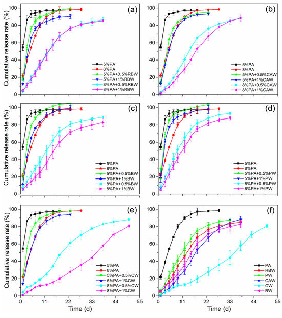 Release performance of wax-modified coated urea with different wax and PA contents. (a) RBW. (b) CAW. (c) BW. (d) PW. (e) CW. (f) Comparison of release longevity between WPACU with 8% content of PA and 1% content of wax, and three replicates for each treatment.