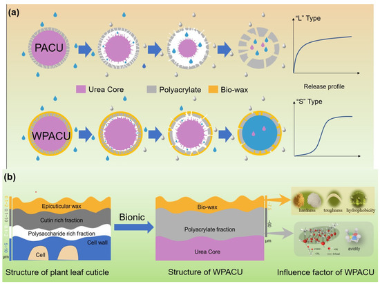 (a) Process of bio-wax biomimetic modification of PACU and film formation mechanism of WPACU. (b) The bio-wax-modified polyacrylate bionic double coating for controlled release fertilizer regarding the structure of plant leaf cuticle.