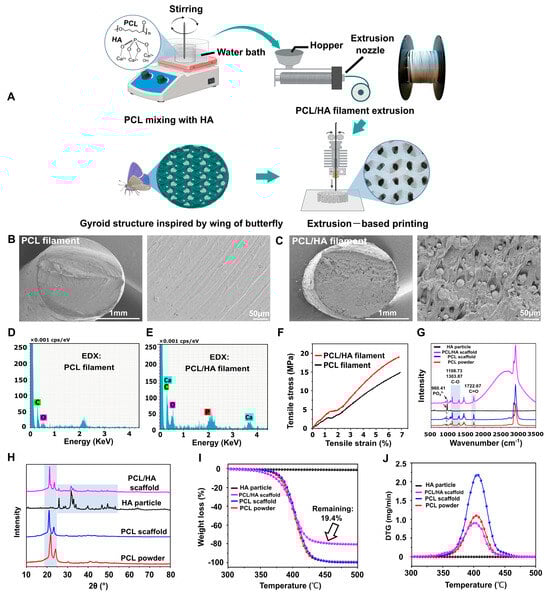 Filaments fabrication and bionic scaffold printing. (A) Schematic diagram of filament fabrication and bionic scaffold printing. Created with BioRender.com. (B,C) SEM images of cross-sections of PCL and PCL/HA filaments. (D,E) Elemental analysis of cross-sections of PCL and PCL/HA filaments. (F) Tensile stress–strain curves of PCL and PCL/HA filaments. (G) Raman spectra analysis of HA particles, PCL/HA scaffold, PCL scaffold, and PCL powders. (H) XRD patterns of HA particles, PCL/HA scaffold, PCL scaffold, and PCL powders. (I,J) TGA and DTG results for HA particles, PCL/HA scaffold, PCL scaffold, and PCL powders.
