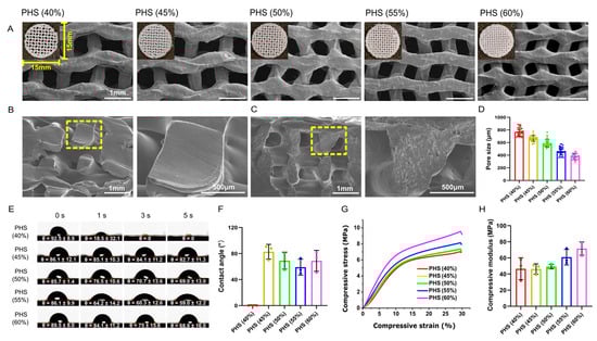 Morphology, hydrophilicity, and mechanical testing results for bionic scaffolds. (A) General and SEM images of five groups of scaffolds. (B,C) Cross-sectional view of PCL and PCL/HA scaffold. (D) SEM image showing pore sizes of scaffolds with different infill densities of 40%, 45%, 50%, 55%, and 60%. (E,F) Water contact angle test of scaffolds (n = 3), with PHS (55% infill) showing the smallest water contact angle. (G) Stress–strain curves of scaffolds. (H) Compressive modulus of scaffolds (n = 3).