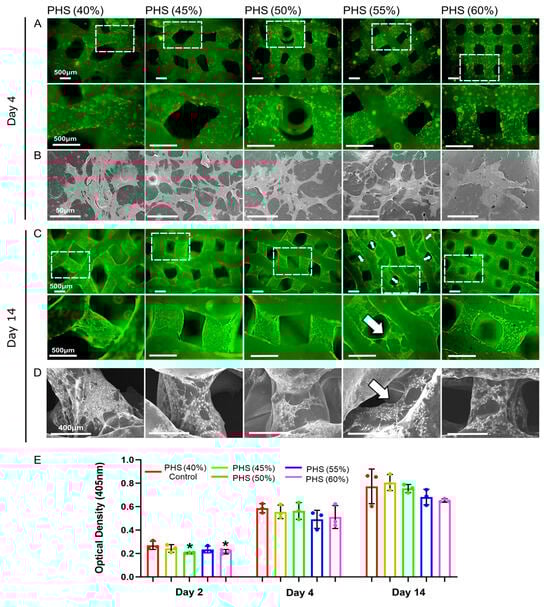 Analysis of bio-compatibility of bionic scaffolds. (A) Live/dead cell staining after 4 days of co-culture. (B) SEM image showing BMSC morphology after 4 days of co-culture. (C) Live/dead cell staining after 14 days of co-culture. (D) SEM image showing BMSC morphology after 14 days of co-culture. (E) CCK-8 test results after 2, 4, and 14 days of co-culture. The white arrow indicates that BMSCs exhibited more significant bridging within the pores of the 55% infill PHS. * = p < 0.05, the Student’s t-test and one-way analysis of variance (ANOVA) with post-hoc analysis to compare the difference between groups and the control group (40% infill PHS).