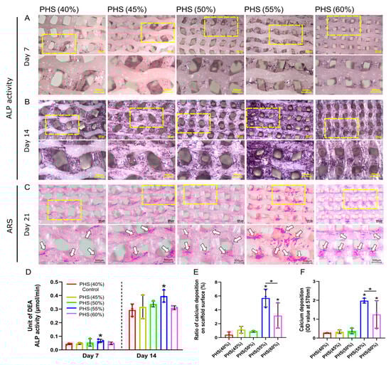 ALP activity of BMSCs and calcium salt deposition using Alizarin Red S (ARS) staining. (A) ALP staining on day 7. (B) ALP staining on day 14. (C) ARS results on day 21. White arrows represent calcium deposition on the scaffolds. (D) Quantitative analysis of ALP property after 7 and 14 days of co-culture for five scaffold groups (n = 3). (E) Ratio of calcium deposition on scaffold surface: the area of calcium salt deposition divided by the surface area of the scaffold. (F) Results of quantitative analysis of calcium deposition on day 21 (n = 3). * = p < 0.05, the Student’s t-test and one-way analysis of variance (ANOVA) with post-hoc analysis to compare the difference between groups and the control group (40% infill PHS). Additionally, calcium deposition also differs significantly between 55% and 60% infill-density scaffolds.
