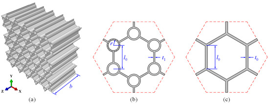 Figure 1 illustrates the three-dimensional schematic diagram of the circular-vertex-based hierarchical hexagonal honeycomb (CHHH, Figure 1a), as well as the unit cell cross-sections of the CHHH (Figure 1b) and regular hexagonal honeycomb (RHH, Figure 1c). It can be seen from Figure 1b,c that the CHHH is constructed by replacing each solid vertex of an RHH with a circular vertex. For the CHHH, t1 and r, respectively, denote the cell wall thickness and radius of the circular vertex, and the distance between the centers of two adjacent circular vertices is l0, as shown in Figure 1b. For an RHH, the cell wall thickness and side length are, respectively, denoted as t0 and l0, as shown in Figure 1c. The overall dimensions of a CHHH are , where Lx and Ly are the length and width along the x and y directions (Figure 1a), respectively, and b is out-of-plane thickness along the z direction. To characterize the vertex-based hierarchy of CHHH, the hierarchical parameter is defined. By considering the constraint of avoiding geometric overlapping, the hierarchical parameter R of the CHHH should satisfy the constraint of , where the cell wall thickness t1 is taken into account.