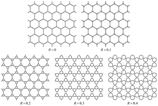To illustrate the meaning of hierarchical parameter R clearly, the cross-sections of CHHHs with different R are presented in Figure 2. It can be seen that the size of the circular vertex in CHHH increases with the increase in R. Meanwhile, it is noted that the CHHH degrades to an RHH when . According to the geometries of the CHHH and RHH, their relative densities can be expressed as follows: