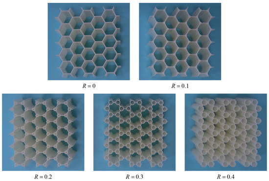 Figure 3 presents the specimens of CHHHs with different hierarchical parameters. These specimens were fabricated using a commercially available 3D printer Objet350 Connex3™ (Stratasys Ltd., den Prairie, MN, USA). The printer has a dimensional accuracy of ±100 µm for models under 100 mm and ±200 µm or ±0.06% of the length for larger models. Utilizing PolyJet technology with 600 dpi (X/Y-axis) and 1600 dpi (Z-axis) resolutions, it can achieve a layer thickness as fine as 16 µm, which enables precise fabrication of complex geometries such as hierarchical honeycombs. For comparison, all specimens have the same overall dimensions, which are , and their masses are also kept the same. The cell wall thickness of the RHH specimen () is , and the side length is . Therefore, according to Equation (2), the relative density of the RHH specimens can be obtained as 0.1053. Using the relative density, R, and l0, the cell wall thickness t1 of the CHHH can be calculated from Equation (1). The geometric dimensions of the CHHH specimens with different R are summarized in Table 1. It can be found from the table that the cell wall thickness t1 of the CHHH decreases with the increase in R as a result of maintaining the same relative density . The base material of the fabricated CHHH specimens was a rigid polymer (VeroWhitePlus). The tensile specimens of the base material were printed and tested in our previous study [1]. According to the tensile test results, the basic mechanical parameters of VeroWhitePlus are as summarized in Table 2.