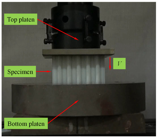 According to the Chinese standard [45], quasi-static out-of-plane compression tests on the CHHH specimens were conducted using a universal testing machine, as shown in Figure 4. During each compression test, the specimen was positioned on the stationary bottom platen of the machine, while the top platen was moved downward at a loading rate of 1 mm/min to apply compression displacement. Both the force and displacement were recorded by the machine, and then they were converted into nominal stress–strain curves according to the geometric dimensions of the CHHH specimens. To ensure the reliability of the test data, three specimens were tested for each hierarchical parameter configuration of the CHHH. In addition, to obtain the deformation modes of the specimens, a video camera was adopted to record the entire test process.