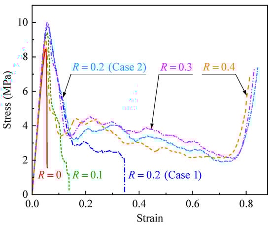 Figure 5 presents the stress–strain curves of CHHHs with different hierarchical parameters R. It can be seen that the stress–strain curve of the RHH (namely a CHHH with ) firstly exhibited a linear elastic region, and then the stress decreased rapidly after reaching the initial peak stress. Additionally, the stress–strain curve of the CHHH with was similar to that of the RHH. For the CHHH with , the stress–strain curves exhibited two different cases: the stress–strain curve of case 1 was similar to that of the RHH, while that of case 2 was similar to the stress–strain curve of regular metallic honeycombs under out-of-plane loading [6], firstly exhibiting a linear elastic region, followed by a plateau region, and finally a densification region where the stress increased rapidly. Note that the stress in the plateau region of case 2 decreased with increasing strain, while that of metallic honeycombs was nearly constant [6], and this was the difference between them. For CHHHs with and 0.4, their stress–strain curves also had a plateau region with gradually decreasing stress, which was similar to that of case 2 for the CHHH with . The difference between the stress–strain curves of CHHHs with different R was caused by their distinct deformation modes.