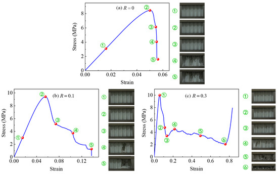 To analyze the deformation modes of CHHHs with different R, a sequence of the representative deformed configurations of CHHHs with , 0.1, and 0.3, corresponding to the red dots on the stress–strain curves, is summarized in Figure 6. As illustrated in Figure 6a, for the RHH (CHHH with ), no significant deformation was observed in the linear elastic region, as shown in configuration ①. Upon reaching the initial peak stress, small local buckling of the cell walls was observed (configuration ②). Subsequently, the stress decreased rapidly, accompanied first by significant local buckling of the cell walls, followed by obvious fracture of the cell walls, and finally, most of the cell walls fractured, as shown in configurations ③, ④, and ⑤, respectively. The deformation process (Figure 6b) of the CHHH with was similar to that of the RHH, which accounts for the similarity observed in their stress–strain curves. However, a difference was that the fracture of the cell walls of the CHHH with was less pronounced and occurred later compared to that of the RHH.