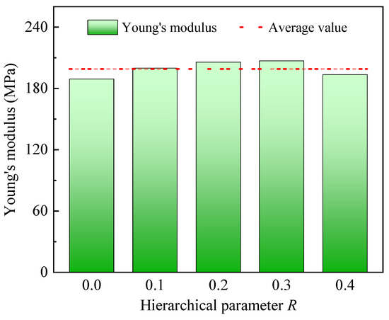 Young’s modulus is a crucial elastic mechanical property for materials, and it can be determined by the slope of the stress–strain curve within the linear elastic region. From Figure 5, it can be seen that the slopes in the elastic region for CHHHs with different R are almost the same. To show it more clearly, Young’s modulus of the CHHH was calculated and is presented in Figure 7. We found that Young’s moduli of CHHHs with different R fluctuate slightly around their average value, and the maximum error between the Young’s moduli and their average value is within 8.5%. The almost consistent can be explained by the finding that Young’s modulus of honeycombs under out-of-plane loading reflects Young’s modulus of base material, and the ratio is scaled by the relative density [46,47], which is a constant in this study.