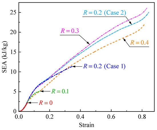 Specific energy absorption (SEA) is defined as the energy absorbed by materials or structures per unit mass, which is a crucial indicator for evaluating the energy absorption capability. Figure 10 shows the SEA–strain curves of CHHHs with different R, where the SEA is calculated by integrating the force–displacement curve and then dividing by mass. It can be seen that the SEA increases with increasing strain. Moreover, for CHHHs with R from 0 to 0.2, the maximum SEA also increases with increasing R. These maximum SEAs, along with the SEAs of CHHHs at the densification strain, are summarized in Figure 11. Here, the maximum SEAs are presented for CHHHs with , 0.1, and 0.2 (case 1), while the SEAs at the densification strain are presented for CHHHs with (case 2), 0.3, and 0.4. As can be seen from Figure 11, the SEA first increases and then decreases with increasing R, reaching its maximum value at . Additionally, the maximum SEA of CHHHs or the SEA of CHHHs at the densification strain is always higher than the maximum SEA of the corresponding RHH with the same mass. Notably, a quantitative comparison shows that the SEA of a CHHH with is 678.1% higher than that of the RHH. This indicates that the energy absorption capability of the RHH can be significantly enhanced by introducing a circular-vertex-based hierarchy and selecting an appropriate value of R.