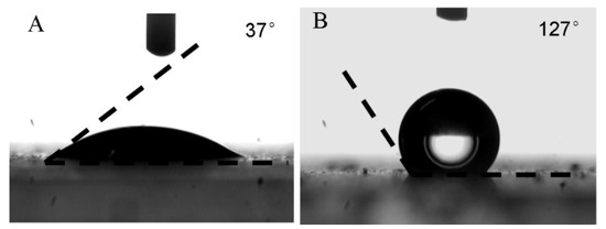 WCA on MNPs (A) unmodified with oleic acid; (B) modified with oleic acid.