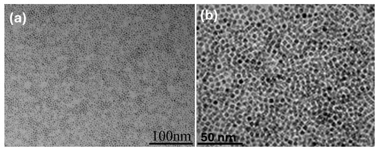 In theory, increasing the amount of oleic acid on the MNP surface should result in enhanced hydrophobicity. In this work, the surface-wetting properties of the oleic acid-modified MNPs were quantitatively evaluated by measuring the water contact angle (WCA) on the MNP surface. To prepare for the measurement, an MNP suspension was spin-coated onto a glass slide and air-dried to create a smooth, flat surface. The results of these measurements are shown in Figure 3. As shown, the unmodified MNPs exhibited a hydrophilic surface with a WCA of 37°. After modification with oleic acid, the WCA increased significantly to 127°, indicating a successful shift from a hydrophilic to a hydrophobic surface. This enhanced hydrophobicity was essential in determining the final encapsulated morphology of MPCPs. As seen in Figure 4a, the MNPs dispersed well in the DVB monomer, further confirming the increased hydrophobicity of the modified MNPs, which allowed for easier dispersion in the oil phase. The average size of dispersed MNPs shown in Figure 4a,b is about 5 ± 1 nm.