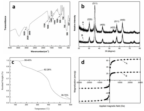 The TGA of S-5 is shown in Figure 6c. A weight loss of 17.72% up to 300 °C corresponds to the removal of water, surfactant, stabilizer, and absorbed oleic acid. The subsequent weight loss of 45.53% between 300 °C and 600 °C is attributed to the decomposition of PDVB. The residual weight of 36.75% represents the pure MNPs. Therefore, the MNP content in S-5 is calculated to be 44.66% (36.75/82.28 × 100%). This high magnetic content is beneficial for the application of these composite microspheres, especially in fields such as biology and pharmaceuticals [23].
