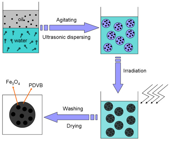 Based on the results, we propose a formation mechanism for MPCPs, illustrated in Scheme 2. Mini-emulsion polymerization proves to be an effective method for encapsulating MNPs within polymers. This is attributed to the inherent characteristics of the mini-emulsion system, which minimizes the presence of micelles in the aqueous phase and reduces the likelihood of nucleation in the aqueous phase, as described in other works utilizing this technique. Polymerization predominantly occurs within the small monomer droplets. Furthermore, the combined action of the emulsifier and stabilizer, coupled with ultrasonic treatment, promotes the formation of mini droplets of monomers containing Fe3O4. As a result, enhanced dispersibility of Fe3O4 within the monomer droplets leads to the formation of MPCPs encapsulating a high content of Fe3O4 following polymerization. Therefore, the surface modification of Fe3O4 is critical in this process, as highlighted throughout this study. Moreover, the fast polymerization rate and high degree of crosslinking of DVB are more beneficial to suppressing the phase separation between Fe3O4 and PDVB, which is also one of our purposes for using DVB [22]. Under sufficient agitating and moderate ultrasonic dispersing, we can obtain a stable mini-emulsion. Then, γ-ray irradiation was used to initiate the polymerization of the DVB monomer and solidify the structure formed during mini-emulsification. Upon γ-ray irradiation of the stabilized mini-emulsion, the polymerization process is initiated. The radiolysis of water leads to the generation of various active intermediates, including hydrated electrons (e-aq), hydrogen radicals (H-), and hydroxyl radicals (-OH). These reactive species then trigger the polymerization of the DVB monomer, resulting in the formation of PDVB nanospheres that encapsulate the Fe3O4 nanoparticles.