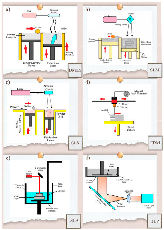 Illustration of various AM techniques and their operating principles: (a) DMLS, (b) SLM, (c) SLS, (d) FDM, (e) SLA and (f) DLP.
