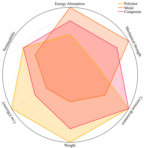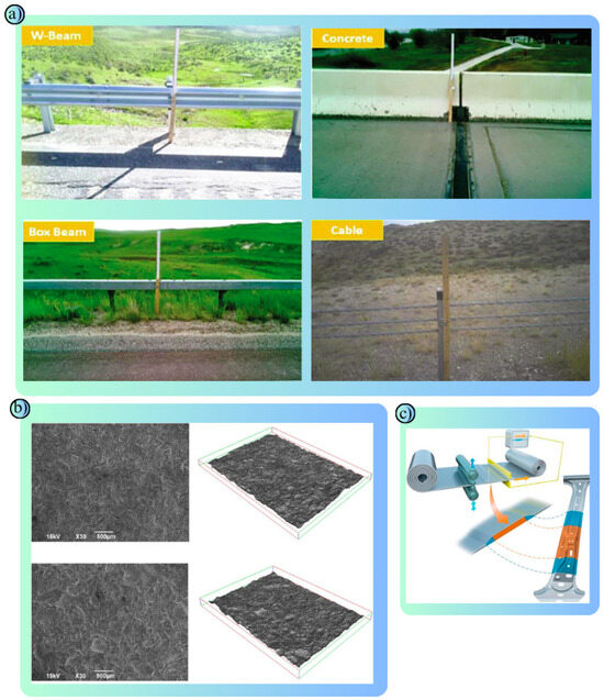 As one of the most important parts of today’s modern transportation systems, road safety aims to ensure sustainability in transportation and reduce fatal/injury accidents [39]. Road safety is highly correlated not only with drivers respecting the rules, but also with vehicles, road materials, road design, traffic regulation equipment and environmental impacts. Road materials, asphalt, concrete, etc., are used to improve the strength, durability and performance of roads [40,41]. Signboards made of reflective materials and paints used in road safety lines aim to improve road visibility [42]. Road safety barriers are of particular importance in minimizing the impact of traffic accidents, reducing fatal/injury accidents and preventing vehicles from leaving the road route (Figure 2a) [43]. Road safety barriers are designed to reduce the impact of collisions, ensure the safety of drivers and other road users, and prevent vehicles from skidding off the roadway [44]. Their performance depends on the properties and type of material from which they are made. Each type of material, selected according to specific use scenarios, has different physical and mechanical properties [45]. In this study, polymers, metals and composites commonly used in road safety barriers are examined. Polymers have advantages such as corrosion resistance and their light weight. Metals are preferred due to their durability and high strength. Composites combine the advantages of these two materials to provide superior performance in terms of both energy absorption and durability. The most used metals in road safety barriers are steel and aluminum. These metals aim to reduce the impact of accidents through their energy absorption capacity and high strength (Figure 2c) [46]. However, their surfaces should be coated for corrosion resistance (Figure 2b) [47]. Polymers stand out with their flexibility, lightness and low-cost advantages and are naturally resistant to corrosion and environmental conditions [48]. Composites, on the other hand, offer a combination of a long life, high-energy absorption and light weight [49]. Composites, which are more costly than traditional materials, are increasingly preferred for their long life and low maintenance costs [50]. Used to improve road safety, these materials play an important role in protecting drivers and other road users and reducing the impact of accidents.