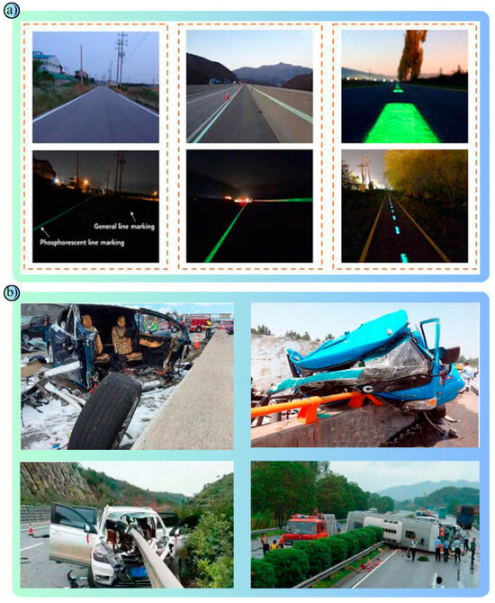 A combined figure presenting the various experimental and modeling components of the studies: (a) Phosphorescent road markings applied in different regions: support driving safety by improving road visibility in low light conditions. It is observed to provide better guidance at night compared to traditional lines [53,54], (b) Accidents with different types of barriers are shown: Concrete barriers keep vehicles on the road but can increase crash severity due to their heavy construction. W-Beam barriers pose a risk of penetration for small vehicles but can be overcome by large vehicles [51,52].