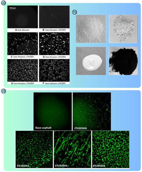 Comprehensive composite visualization representing the experimental and modeling processes of the studies in an integrated manner: (a) Microstructural analysis of bitumen modified with Styrene-Butadiene-Styrene (SBS): Polymer fluorescence microscope images of bitumen modified with different SBS ratios are shown. It is observed that the polymer phase distribution becomes more homogeneous and denser as the SBS content increases [55]. (b) Four different types of polymers used in asphalt modification are shown: SBS (Styrene-Butadiene-Styrene): Provides elasticity. EVA (Ethylene-Vinyl Acetate): Provides rigidity and high-temperature resistance. SBR (Styrene-Butadiene Rubber): Improves bonding properties. Waste Rubber: Offers the advantage of recyclability and flexibility [56,57]. (c) Fluorescence microscope images of asphalt modified with different SBS ratios are shown. With increasing SBS content, the polymer phase became more visible, and the elastic properties of the asphalt increased [57].