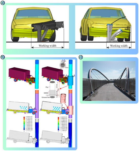 A unified visual that presents the experimental and modeling approaches of the studies in a holistic way: (a) The post-crash deformation behavior of different barrier designs is shown: The conventional barrier has a wider working width, while the enhanced barrier shows a more controlled deformation, helping to steer the vehicle [77]. (b) Simulation of bridge abutment impact in the finite element method (FEM) analysis; the impact of a truck on a bridge abutment is modeled. While the unprotected abutment is severely affected by the impact, the abutment protected with MHSS (Metal Honeycomb Safety Structure) shows lower stresses and maintains its structural integrity better [78]. (c) It is a modern pedestrian bridge in Holyhead, United Kingdom: Made of stainless steel, it is an important example of aesthetic and engineering design [79].