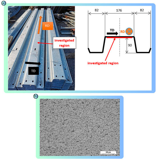 Comprehensive illustrative representation that brings together experimental data and modeling results from studies: (a) The analyzed region of the traffic barrier flanges and the orientation axes are shown: RD (Rolling Direction) and TD (Transverse Direction) are indicated and the region where the mechanical tests were performed is marked, (b) The sample shows a ferritic matrix structure and irregularly distributed pearlite islands: The 1% Nital etched microstructure was studied to evaluate the homogeneity and mechanical properties of the steel [92].
