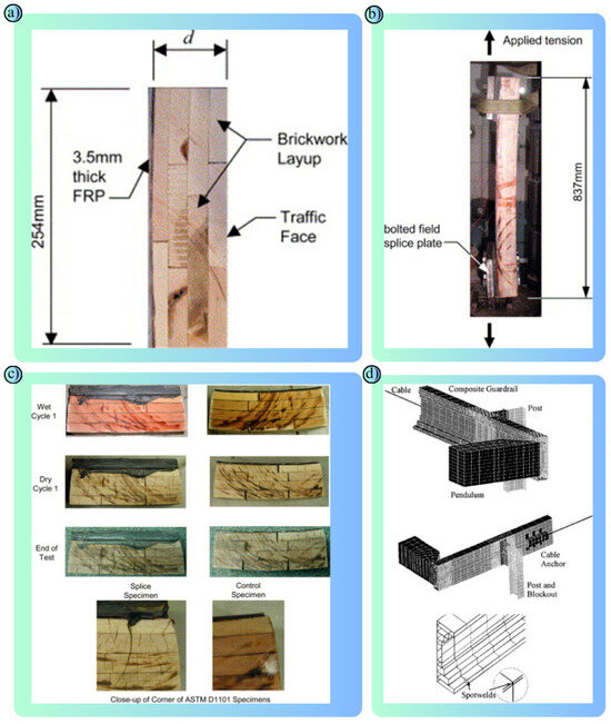 Comprehensive schema that integrally visualizes the experimental analyses and modeling components of the studies: (a) FRP-Glulam Barrier Section: 3.5 mm FRP cladding and a cross-section of a barrier with laminated timber in a brick pattern are shown [101]. (b) Tensile Test Specimen: The 837 mm long specimen was subjected to a tensile test with a bolted connection plate. Strain gauges were used to monitor the maximum stresses on the FRP [101]. (c) ASTM D1101 Test Results: Specimens exposed to moisture and drying cycles showed no delamination in the steel-reinforced specimens, while small cracks were detected in the control specimens [101]. (d) LS-DYNA Composite Barrier Model: The crash behavior of the barrier was modeled using the finite element method (FEM). Spotwelds were used to connect the composite parts [102].