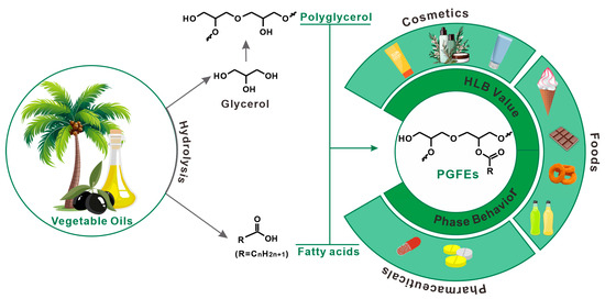 Although the synthesis and methods of analysis of PGFEs have been summarized [15], their applications and related important properties (e.g., HLB value and phase behavior) have not been reviewed in detail in recent years. In this review, the properties of PGFEs, including their HLB values and phase behaviors in various mixture systems, are summarized, with an emphasis on their potential applications in food, cosmetics, and pharmaceuticals observed in the last decade.