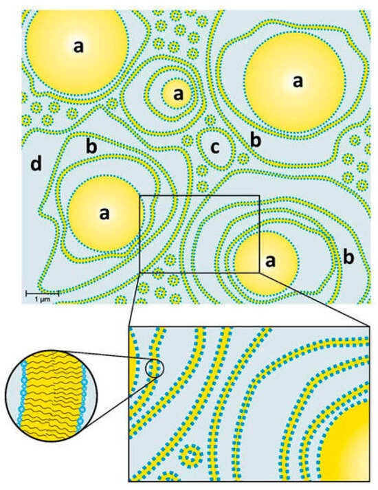 - Duerr-Auster, N.; Kohlbrecher, J.; Zuercher, T.; Gunde, R.; Fischer, P.; Windhab, E. Microstructure and Stability of a Lamellar Liquid Crystalline and Gel Phase Formed by a Polyglycerol Ester Mixture in Dilute Aqueous Solution. Langmuir 2007, 23, 12827–12834. [Google Scholar] [CrossRef]