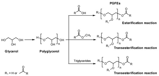 The typical preparation of PGFEs is as follows: (1) glycerol is dehydrated and polymerized using alkali (e.g., NaOH and K2CO3) or acid (e.g., H2SO4) as a catalyst to prepare polyglycerol, and the average degree of the polymerization of PG can be regulated via controlling the dehydration; (2) then, PGFEs can be prepared using (a) the esterification reaction between PG and fatty acids or (b) the transesterification reaction of PG with fatty acid esters or triglycerides in the absence of solvents (Scheme 1).
