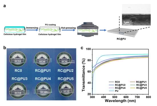 The cellulose was dissolved in 8 wt% LiOH·H2O/15 wt% urea aqueous solution to obtain a transparent solution (6 wt%) [21,22]. The cellulose solution was placed at −40 °C until the solution was completely frozen. After being thawed and mechanically stirred at 800 rpm, the cellulose was fully dissolved. The cellulose solution was evenly divided into the centrifugal tube, and then centrifuged (−3 °C, 6000 rpm, 10 min) to remove bubbles. The centrifuged solution was poured onto a glass plate, and the film was spread by the casting method. The gel was regenerated in a 5 wt% sulfuric acid solution, and then washed with deionized water to obtain a regenerated cellulose (RC) hydrogel film. In addition, the RC hydrogel film was soaked in WPU solution for 24 h, then sandwiched between two stainless steel plates, followed by a hot pressing (Qi En Technology, Wuhan, China) at 107 °C, 3 MPa for about 2 h. The RC@PU film was obtained when the film was removed from the hot press plate and the temperature dropped to room temperature (25 °C). According to the concentration of WPU solution (1, 2, 3, 4, 5 wt%), the films were coded as RC@PU1, RC@PU2, RC@PU3, RC@PU4 and RC@PU5, respectively. RC hydrogel film without immersing in WPU solution was coded as RCH, and the RC film obtained after hot pressing without immersing in WPU solution was coded as RC0.
