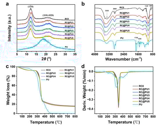 In order to evaluate the thermal stability of PU, RC0 and RC@PU films, the thermogravimetric curves of each group of films were obtained by testing, as shown in Figure 2c. The thermal decomposition of PU occurs between 150 and 480 °C, while the thermal decomposition of cellulose mainly occurs between 260 and 370 °C. The thermal decomposition rates of PU, RC0 and RC@PU films during the test are shown in Figure 2d. The thermal decomposition of PU is primarily concentrated around 318 °C. Due to the introduction of PU, a peak in the RC@PU films appears near 300 °C compared to RC0, which is attributed to the decomposition of PU in the RC@PU films. The decomposition peaks of cellulose appear in both RC0 and RC@PU films near 343 °C [35], and their decomposition temperatures are listed in Table S1. The decomposition temperatures of RC@PU films are greater than the decomposition temperature of RC0, indicating that the introduction of PU improves the thermal stability of the cellulose films to some extent. These results further confirm the strong hydrogen bond interactions between PU and cellulose [36].
