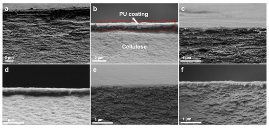 The cross-sectional morphologies of RC0 and RC@PU films are shown in Figure 3, and the SEM image of the cross-section of PU film is shown in Figure S5a. It can be observed that the cross-section of PU film is smooth; meanwhile, the cross sections of RC0 and RC@PU films are characterized by stratification and density. By comparing the RCH section (Figure S1c,d) and the RC film section soaked in 1 wt% PU solution and air-dried (Figure S2b), the formation process of the RC0 and RC@PU films cross-sections could be further understood. The film formation of cellulose in RCH can be better reduced by liquid nitrogen freezing and freeze-drying. The cross-section of RCH is loose and porous, while Figure S2b shows that RC film has a certain degree of stratification, loose and porous cross-section in the state of natural air drying [37,38]. Therefore, the stratification and densification of RC0 and RC@PU film sections can be attributed to the fact that RC films are extruded to the middle under the action of high pressure on both sides during the hot-pressing process, which intensifies the stratification phenomenon, and the spacing between cellulose chain segments decreases, making the films more compact [39]. Compared with RC0 (Figure 3a), a layer of coating substance could be observed on the layered dense cellulose film in the sectional SEM diagram of RC@PU1-5 (Figure 3b–f), and it is reasonable to assume that the coating substance is PU coating. RC@PU1 soaked by immersion solution with minimum PU content is selected for cross-sectional EDS test, and the results are obtained as shown in Figure S3 and Table S2. In the cross-section SEM diagram of RC@PU1 (Figure S3a), three points (b, c and d) are selected from top to bottom for EDS point scanning. Among them, point b is located at the coated material, point c is located at the junction between the coating and the cellulose film, and point d is located on the cellulose film. In the EDS images, there is an obvious N-peak at point b, a weak N-peak at point c, and a little N-peak at point d. In the element content table of each point obtained by the test (Table S2), the mass fraction (ω) of N at point b is 1.07 wt%, and ω (N) > 3 × Nσ, which proves that there is N element at point b. The mass fraction of N at point c is 0.48 wt%, but it does not meet the condition of ω (N) > 3 × Nσ, which indicates that there may be N elements at point c. The mass fraction of N at point d is 0, suggesting that point d does not contain N elements. Since the N element existed only in PU in RC@PU films, the coating substances in RC@PU films cross-section are indeed PU, and PU existed in RC@PU films essentially in the form of coatings on the surface of cellulose films. At the same time, it is further proved that after soaking and hot-pressing steps, PU was successfully introduced and retained on the RC@PU films in the form of coatings. In Figure S2b, the thickness of the PU coating on the RC@PU film soaked in 1 wt% PU solution and naturally air-dried is about 1 µm. By measuring the coating thickness in multiple SEM images of each group of RC@PU films, the coating thickness curve of RC@PU1-5 is obtained (Figure S4). The coating thickness of RC@PU films ranges from 0.17 to 0.27 µm, and the coating thickness increases with an increase in PU content in the immersion solution. By comparing the coating thickness before and after hot pressing, it can be found that the PU coatings on RC@PU films also become more compact under the action of high temperature and pressure.