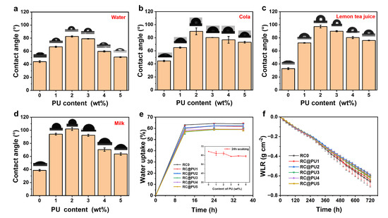 Figure 5a–d show the contact angles of RC0 and RC@PU films with water, cola, lemon tea juice and milk, respectively. In Figure 5a, the water contact angle of RC0 is 43.9°, which is attributed to the presence of a large number of hydroxyl groups on the cellulose, making the cellulose films highly hydrophilic [42]. In Figure S5c, the water contact angle of PU film is 88.2 ± 1.5°. The water contact angles of RC@PU films are higher than that of RC0, with the water contact angle of RC@PU2 reaching 82.5°, indicating that the introduction of PU coatings enhanced the hydrophobicity of the RC@PU films [3,43,44]. When in contact with drinks where water is the main component, such as cola, lemon tea, and milk, the contact angles of the RC0 film were 44.4°, 32.8° and 38.6°, respectively, all demonstrating good wettability. In contrast, the contact angles of the RC@PU2 film with these drinks were 89.8°, 97.2° and 102.0°, indicating that the RC@PU2 film is less likely to be wetted and exhibits certain anti-fouling properties against these drinks. As shown in Figure 5a–d, with an increase in PU content in the soaking solution, the contact angles between RC@PU films and the four drinks first increased and then decreased. When the PU content was between 1–2 wt%, the surface roughness of the RC@PU films gradually increased, and at the same time, hydrophobic groups, such as alkyl chains in the PU, became more prominent, resulting in an increase in the contact angles between RC@PU films and the four liquid substances within this content range.