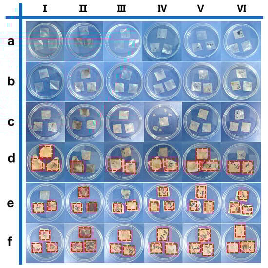 Photographs of (I) RC0 and (II–VI) RC@PU1-5 films taken at (a) 7, (b) 14, (c) 28, (d) 42, (e) 56, and 70 days (f) after starting the degradation process.