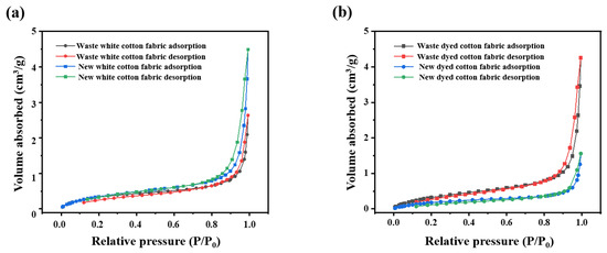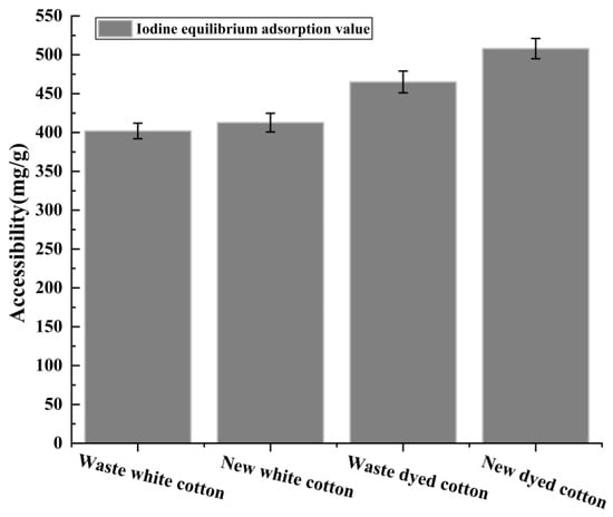 - The iodine equilibrium adsorption value of the new pure cotton fabric is slightly higher than that of the waste fabric, indicating enhanced accessibility. However, the crystallinity of the waste fabric remains unchanged and even exhibits a higher XRD intensity compared to that of the new dyed fabric. Notably, there is no direct linear relationship between cellulose crystallinity and fabric strength. BET test results reveal no correlation between the specific surface area of long-term used fabrics and that of newly produced fabrics.