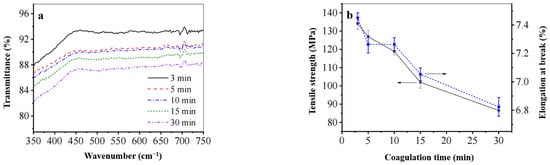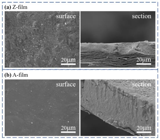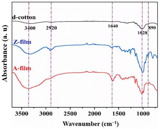 - Under optimal processing conditions, the Z-film demonstrates lower mechanical properties (91.0 MPa) and transparency (89.3%) in comparison to the A-film (139.6 MPa) and (93.0%). Surface morphology analysis indicates that the Z-film possesses a defective epidermal layer, whereas the A-film features a smooth surface with uniform density throughout its cross-section. Deformation vibration absorption peaks for CH2 and C–O–H appear at 890 cm−1 for both films; however, the Z-film shows slightly higher crystallinity (29.2%) than the A-film (21.3%).
