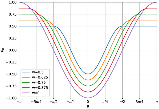 Plot of as a function of for . Curves are shown for values of w ranging between 0.5 and 1. Note that the maximum gradient of is consistent across for all values of w due to the scaling of the potential.