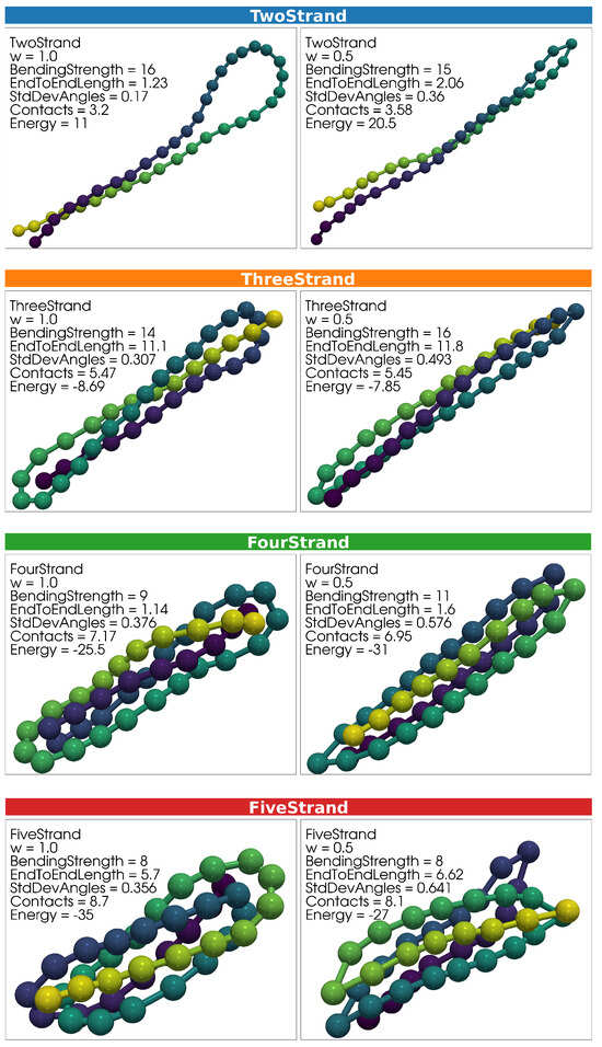 The top row of Figure 2 presents two representative Two-Strand structures. The first example is from the simulation, and the second is from the simulation. The example structure features a broad, arcing joint that minimizes individual bending angle deviations from 0 degrees. The vertical extension of the Two-Strand structure cluster in Figure 5b reflects variability in joint types, ranging from the broad arcing joint shown here to a narrower joint more closely resembling the example structure. This variation results from a trade-off between maximizing the number of contacts and minimizing the total bending energy penalty. In contrast, all Two-Strand structures in the simulation exhibit narrow joints, where a single bending angle bears most of the bending penalty, allowing other angles to remain near 0 degrees.
