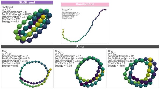 A representative Six-Strand hairpin structure from the simulation is shown. No Six-Strand structures were produced in the simulations. A representative Random Coil structure from the simulation is shown. Without systematic variation with w, we did not feel it necessary to include a example. Ring structures from each of the distinct Ring clusters identified in Figure 5b are displayed in the second row. Within each panel, the bending strength, End-to-End Length, Average Number of Contacts, and energy are indicated. While these examples illustrate the general structural characteristics, the structural variability within each type extends beyond what is captured in this figure. Rectangles labeling structural representations are colored according to structure types, consistent with the point-color scheme in Figures 5–7. Monomers within each polymer structure are colored according to a gradient solely to visually distinguish overlapping strands. Colors do not indicate any additional quantitative property.
