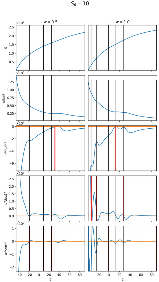 Example plots of the first four derivatives of S for bending strength of . The left column corresponds to , and the right . Zero lines are shown in orange, and vertical red lines indicate zero crossings in the derivatives that correspond to structural transitions. Vertical black lines mark the transition energies, aligning these crossings across all derivative orders.
