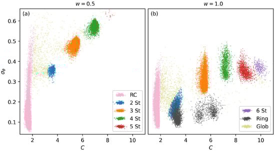 Structures are classified by analyzing the clustering of example structures across an array of carefully chosen structural parameters. The primary parameters used to distinguish structures are the standard deviation of bending angles () and the per-monomer number of contacts (C). Scatter plots illustrating the structures produced in selected simulation runs are presented in Figure 5. Each panel represents a sampling of structures from every thread of a single two-dimensional parallel tempering simulation. Structure clusters are identifiable through visual inspection. Three-dimensional models of representative structures within each cluster are examined, and all structures are labeled according to their respective clusters. While some clusters overlap in the two-dimensional representations shown here, they can be distinguished by considering their positions in additional structural parameters, such as energy (E) and end-to-end length (). This multi-parameter classification helps ensure that structural distinctions are robust. Three-dimensional representations of example structures from each cluster are presented in Section 3.1.
