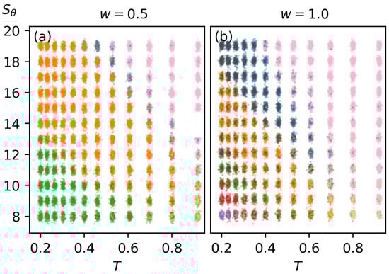 In this study, variations in the Hamiltonian H correspond to changes in the bending energy scale factor, . The temperature values T are logarithmically spaced from to , facilitating efficient sampling across a broad thermal spectrum. For each set of and T, simulations are performed for values of w ranging from to , where recovers the standard semiflexible polymer model.