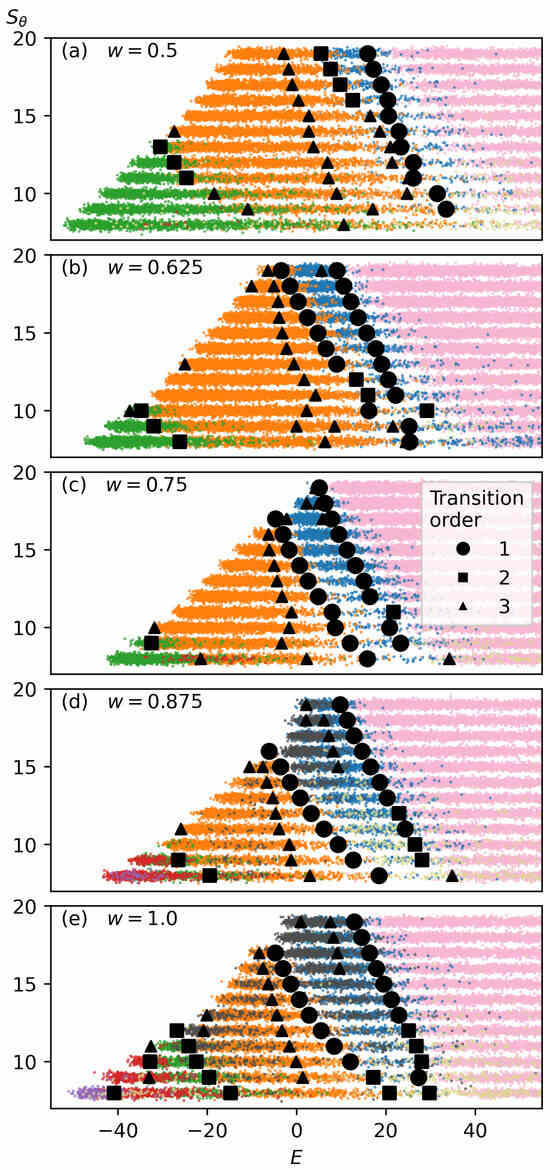 Microcanonical structural transition diagram, plotting structures as a function of bending strength () and energy (E), Transition points are marked by circles for first-order transitions, squares for second-order transitions, and triangles for third-order transitions. The colors representing each structure type are the same as in Figure 5.