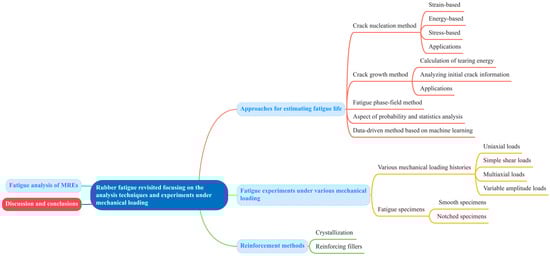 This paper is structured as follows (see Figure 2): Section 2 reviews various analytical approaches for rubber, rubber-like materials, and elastomers, along with their applications in different rubber components. Section 3 explores fatigue experiments reported in the literature, focusing on two key aspects: types of mechanical loading and fatigue specimen selection. Section 4 discusses reinforcement methods aimed at enhancing the fatigue resistance of rubber materials. In particular, recent advancements in the fatigue performance of magnetorheological elastomers (MREs) are presented in Section 5. Lastly, Section 6 outlines future trends in this field and concludes the paper.