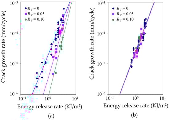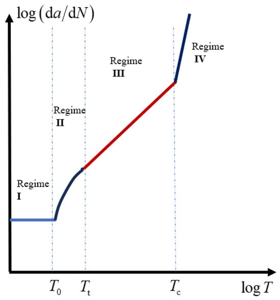 As for the general case of rubber rupture, Rivlin and Thomas [32] established that the correlation between crack growth rate and strain energy release rate is an intrinsic material characteristic, demonstrating invariance across different loading configurations and geometric parameters of test specimens. Fatigue crack growth behavior can typically be categorized into four distinct regimes (shown in Figure 4), based on the maximum tearing energy per cycle [88,89,90]. Regime III, which follows a power–law relationship, is commonly used to fit experimental crack growth data, allowing for the extraction of the constants B and β, such that: