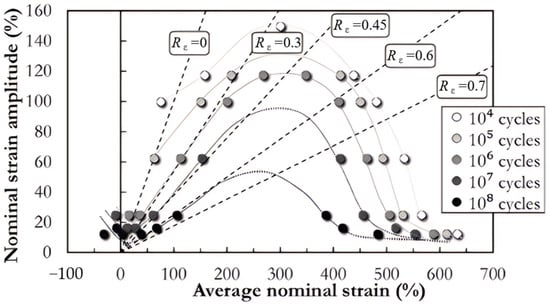Based on continuous damage mechanics (CDMs), Ayoub et al. [64] proposed an equivalent stress parameter (a CDM-predictor) based on the extension of the CDM model in [65] and then proposed another three-dimensional model coupled with the CED [35] to assess the fatigue life of SBR under combined tension and torsion loading with constant and variable amplitudes [12,66]. The developed CDM/CED model, which incorporates a fatigue damage parameter coupled with an accumulative damage rule, is suggested to provide a satisfactory agreement with experimental data under complex fatigue loading conditions. Its effectiveness was further examined by considering the effect of load ratio and was verified by Ayoub et al. [66].