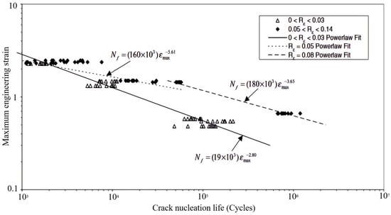 The crack nucleation approach is based on continuum mechanics [11], damage mechanics [12], and configuration mechanics [13], where the material is typically assumed to maintain internal homogeneity and continuity from the onset of loading until the point of crack initiation. The crack nucleation approach considers that a material possesses an inherent lifespan dictated by the stress or strain history at each material point in the body, regardless of the specimen geometry or the type of loading. A damage parameter (also known as fatigue predictor, criteria, prediction factors, mechanical parameters, damage indicators, etc.), which correlates with the local force, deformation, or energy state of the material, is of crucial importance to be determined in advance. The damage parameter can typically be expressed in terms of stresses and strains, concepts well-known to designers, which makes the approach relatively convenient and popular in engineering applications. In particular, the approach is especially suitable for scenarios where the initial defects, which ultimately determine component life, are significantly smaller than the component’s features and where analyzing the spatial distribution of fatigue life is essential.